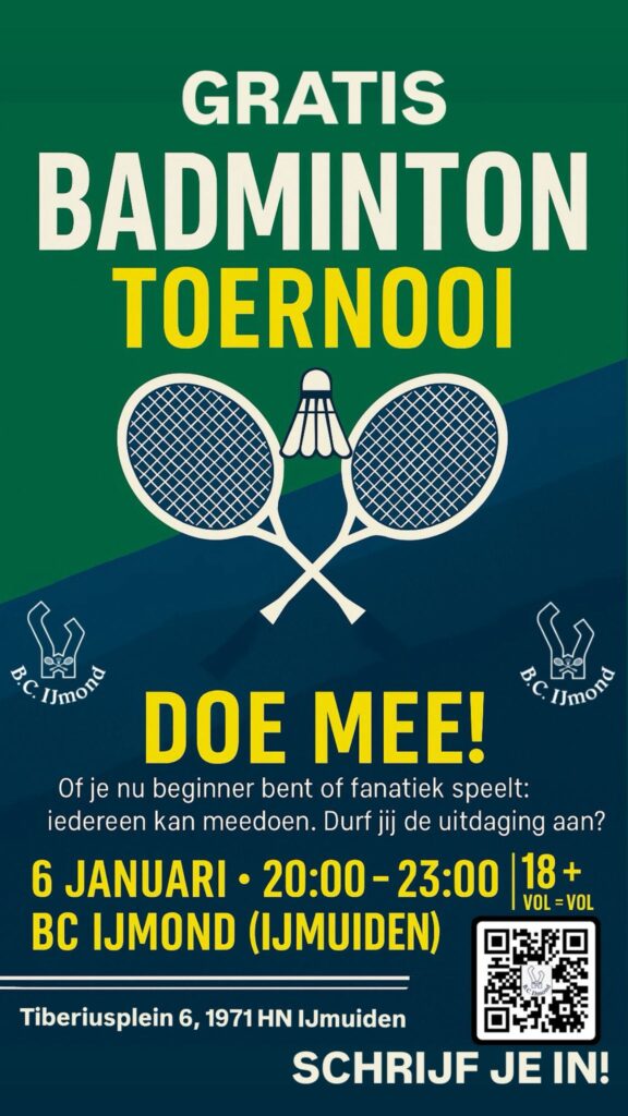 Op 6 januari organiseert een groep studenten van de hogeschool van Amsterdam een gratis badmintontoernooi bij B.C. IJmond. Een leuke en laagdrempelige manier om kennis te maken met badminton en onze club. Het toernooi vindt plaats op maandag 6 januari van 20.00 tot 23.00 uur in sporthal IJmuiden-Oost.